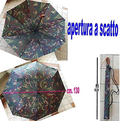 OMBRELLO MIMETICO OMBRELLO CON APERTURA A SCATTO DI BUONE DIMENSIONI MOLTO PRATICO E COMODO DA TRASPORTARE GRAZIE AL SUO MINIMO INGOMBRO SOLO CM. 53 RIPOSTI IN UNA COMODA CUSTODIA DOTATA DI LACCIO PER LA TRACOLLA. OMBRELLO APERTO DIAMETRO 123 CM.