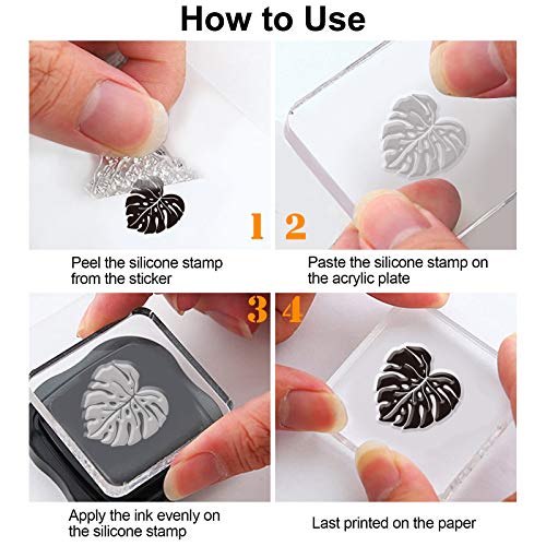 Comodo da usare: basta staccare il timbro dal foglio trasparente e applicarlo a un blocco acrilico, quindi applicare l'inchiostro sul timbro, posizionare i motivi da stampare sulla superficie che si desidera applicare e premere con decisione per un po ', quindi si otterrà motivi chiari e belli sui tuoi oggetti.