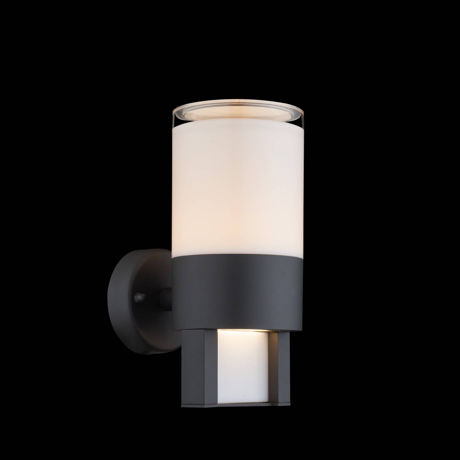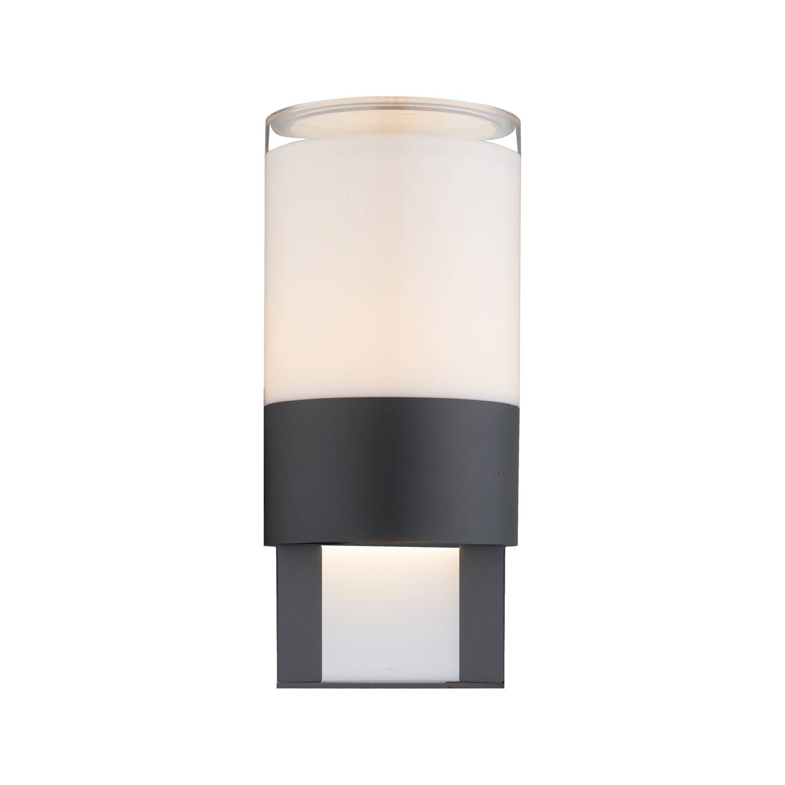 Moderno apparecchio da parete esterno a LED Nexa in forma cilindrica Il grande diffusore in plastica opalina montato nella parte superiore emette la luce bianca calda tutto intorno e non solo illumina i percorsi e le aree di ingresso, ma mette in scena anche la facciata. Inoltre, una rientranza nell'estensione inferiore emette anche una parte discreta della luce verso il basso, in modo da aggiungere un'ulteriore luce di orientamento. Con il suo caratteristico design e l'involucro in alluminio pressofuso grigio antracite, l'apparecchio da esterno a parete a LED Nexa si armonizza perfettamente con un moderno design di proprietà.