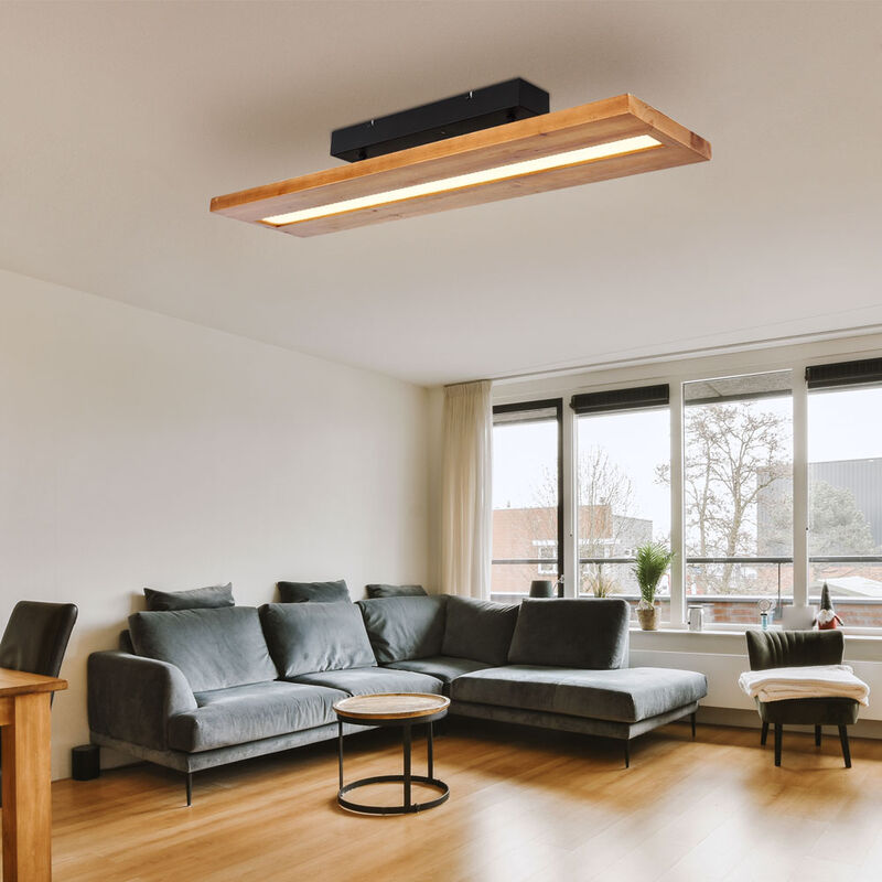 Descrizione Questa plafoniera di (80x20 cm) completa la tua casa con un'elegante fonte di luce. Consiste in una trave di legno marrone con una striscia di plastica opalina al centro. Questo copre le lampade a LED incluse, che forniscono 1380 lumen di luce con un piacevole colore della luce di 3000 Kelvin (bianco caldo). Con altri modelli della stessa serie, puoi dare il tocco finale ai tuoi interni. Una lampadina a LED è inclusa nella fornitura. Particolare lampada • Tipo di lampada: plafoniera • Materiale: metallo, legno, plastica • Colore: marrone, nero, opale • Grado di protezione: IP20 • Altezza x lunghezza x larghezza in cm: 19,5x80x20 • Illuminante: 1x LED • Lampadine incluse: Sì (installate in modo permanente) • Potenza lampada: 1x 25 watt • Flusso luminoso: 1x 1380 lumen • Colore della luce: bianco caldo • Alimentazione: 230V, 50Hz Dettagli lampadine • Tipo di sorgente luminosa: LED • Flusso luminoso: 1380 lm (lumen) • Consumo energetico: 25 kWh/1000h • Temperatura colore