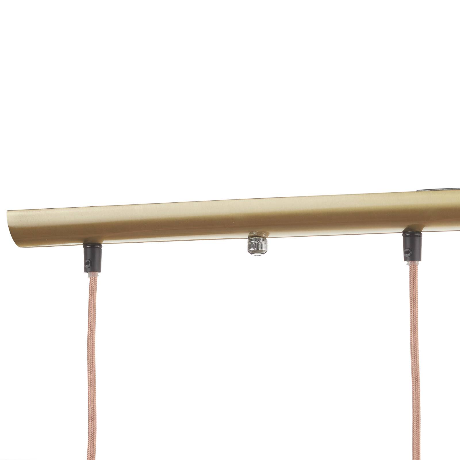 Lampada a sospensione Annika color ottone con paralumi in vetro Un design unico per ogni stanza: la lampada a sospensione Annika valorizza la casa con un tocco di classe. Questo oggetto di design si distingue per i portalampade in ottone opaco, il vetro colorato e il cavo marrone rivestito di tessuto. Eleganza semplice e design classico si uniscono per formare un insieme armonioso. La lampada a sospensione è formata da quattro paralumi di forma cilindrica, perfettamente allineati. Annika è una lampada di classe che colpisce per il design semplice e ultramoderno. Perfetta per una cucina arredata in stile moderno o per un lungo tavolo da pranzo in legno scuro, questa lampada di bella forma rende al meglio se completata con lampadine rustiche o a filamento - per trascorrere qualche ora indimenticabile in compagnia di amici o familiari.