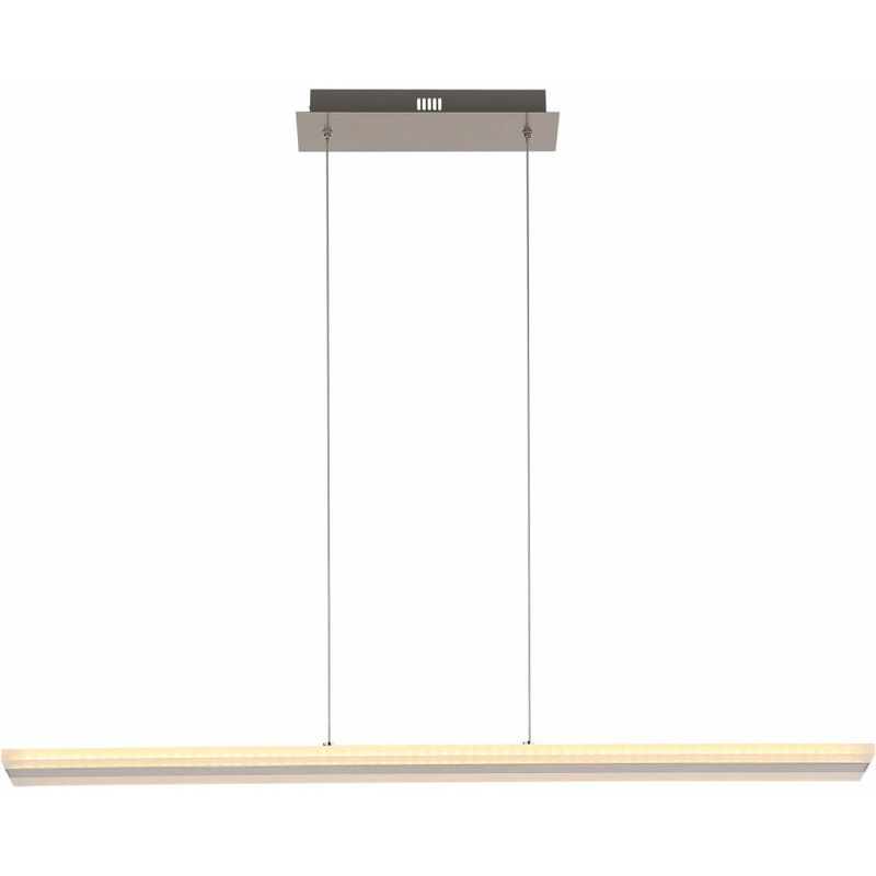 Descrizione Elegante lampada a sospensione per interni dal design moderno. Questa lampada si adatta perfettamente al tuo soggiorno, sala da pranzo o tavolo da cucina. Un vero colpo d'occhio! La potente lampada con satten 2240 lumen illuminerà perfettamente lo spazio abitativo prescelto. Rispetto alle normali luci, i faretti a LED consumano solo una minima quantità di Elettricità e sono in consumo anche lampade a risparmio energetico unter. Questo protegge l'ambiente e il tuo portafoglio. Una sorgente luminosa a LED di alta qualità a risparmio energetico è inclusa nella fornitura. Dettagli lampada • Tipo di lampada: sospensione • Materiale: nichel opaco, alluminio • Paralume: acrilico satinato • Dimensioni LxPxH in cm: 90x10x120 • Prese: 1x LED • lampadine incluse: si • lampadine elettriche: 1x 28 watt, 34 volt • flusso luminoso: 2240 lumen • colore luce: bianco caldo • alimentazione: 220V bis 240V, da 50Hz a 60 Hz • Le lampade non possono essere sostituite nell'apparecchio. Dettagli