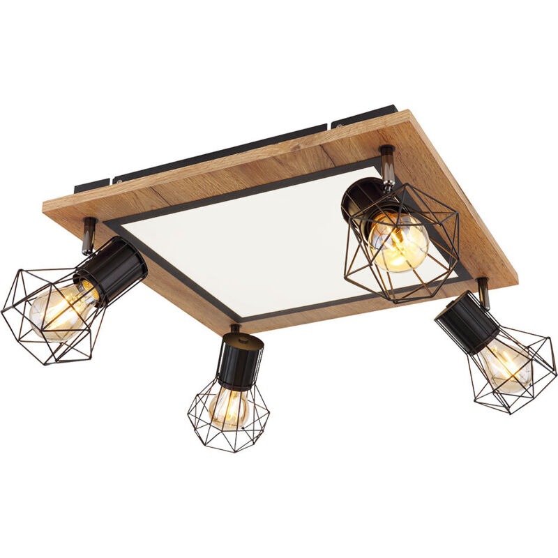 Descrizione Questa plafoniera quadrata convince per il suo aspetto fantastico. Al centro di una piastra di legno (45x45 cm) si trova una scheda LED con quattro lampade aggiuntive e un elegante paralume a griglia metallica. La scheda produce una piacevole luce bianca calda di 3000 Kelvin e ha 24W. La funzione di memoria consente di conservare le ultime impostazioni utilizzate. È possibile commutare più livelli tramite un interruttore a parete: livello 1 solo la scheda LED, livello 2 solo i faretti E27, livello 3 scheda LED e faretti E27 insieme. La scheda LED è installata in modo fisso nella lampada, le lampadine per gli attacchi GU10 non sono comprese nella fornitura. Lampada dettagli • Tipo di lampada: plafoniera • Materiale: plastica, MDF, metallo • Colore: aspetto legno, nero, opale • Classe di protezione: 2 • Grado di protezione: IP20 • faretti girevoli • più livelli tramite interruttori a parete (vedi descrizione) • Funzione di memoria • Lunghezza x larghezza x altezza in cm: 45