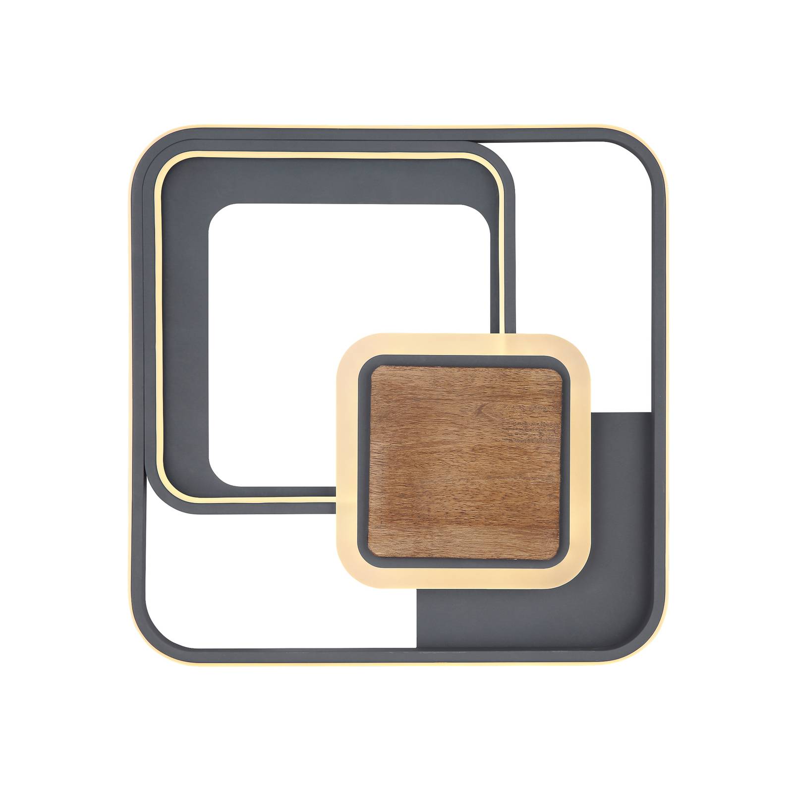 Plafoniera LED quadrata Nirra in ferro con elemento in legno Nirra non è solo una moderna plafoniera LED, ma convince anche per il suo design particolare. Si compone di tre telai in ferro color grafite che circondano un elemento in legno altrettanto angolare. All'interno e all'esterno delle cornici sono applicati dei LED che generano un'illuminazione bianca calda. L'accattivante combinazione di colori tra grafite e legno scuro conferisce all'apparecchio un attraente contrasto cromatico. La plafoniera Nirra LED è ideale per l'installazione in un corridoio o in un soggiorno.