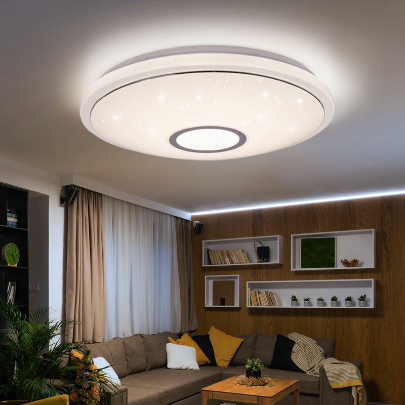 Descrizione Questa plafoniera moderna ma semplice è adatta per l'anticamera, il corridoio, il bagno o la camera da letto. Il diametro è di 50 cm. La lampada è dotata di una scheda LED da 24W, 1400lm. Utilizzando l'interruttore a parete (non incluso) puoi scegliere tra tre diversi colori di luce, 3.000-4.500-6.000 Kelvin. Nella lampada è già installata una sorgente luminosa a LED. Lampada dettagli • Tipo di luce: plafoniera • Materiale: metallo • Paralume: acrilico, bianco, anello cromato (molti piccoli punti traslucidi) • Circuito CCT (vedi descrizione) • Grado di protezione: IP20 • Diametro x altezza in cm: 50x9,5 • Sorgente luminosa: 1x scheda LED • Lampadine incluse: sì • Potenza lampada: 24 watt • Flusso luminoso: 1400 lumen • Temperatura colore: 3000 - 4500 - 6000 Kelvin • Colore della luce: bianco caldo - bianco freddo • Alimentazione: da 220 V a 240 V, da 50 Hz a 60 Hz • Le lampade nell'apparecchio non possono essere sostituite. Dettagli lampadine • Tipo di lampadina: LED