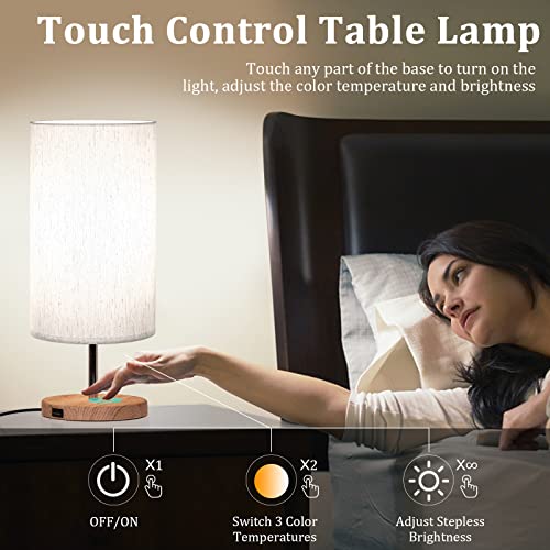 GLUROO Set di 2 Lampade da Tavolo o da Comodino con Controllo Touch, 3 Temperature di Colore e Luminosità Continua, Porte di Ricarica USB, Camera dei Bambini, Ufficio, legno