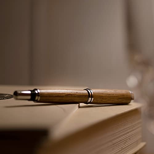 La penna ha una lunghezza di 14,2 cm e un peso di circa 85 g. È stato realizzato in vero legno di qualità e acciaio cromato rodiato in modo sostenibile. La penna stilografica è progettata per il funzionamento del convertitore e della cartuccia. Piantiamo un albero per ogni penna ordinata e compensiamo così la nostra impronta perché il nostro ambiente ci sta a cuore.