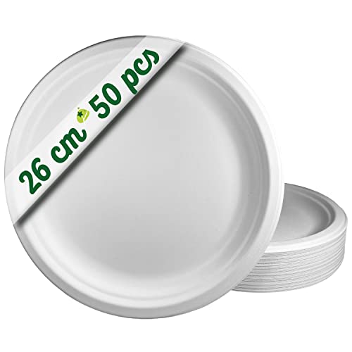 CONTENUTO: La confezione contiene 50 piatti circolari monouso in canna da zucchero bianca di alta qualità. Viene fornito in 2 confezioni da 25 pezzi. I piatti rotondi di canna da zucchero hanno un diametro di 26 cm.