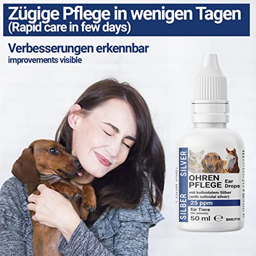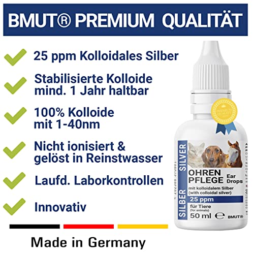 BMUT 1 goccia per orecchie da 50 ml per cani e gatti con argento colloidale - 25 ppm - cura delle orecchie, prurito, arrossamento