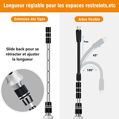 Barra di estensione per albero flessibile da 10 a 12 pollici, comfort ed ergonomia: con un cappuccio posteriore galleggiante, una sovrastampatura gommata aderente che tollera le mani grasse. Il cacciavite stesso è dotato di una punta magnetica, utile sia per rimuovere le viti che per allinearle con il foro, e l'asta di estensione flessibile consente di regolare la lunghezza del cacciavite in base alle dimensioni dell'oggetto che si sta lavorando.