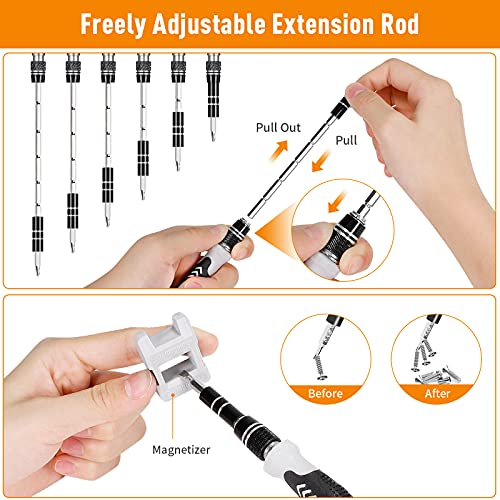 【Set di Cacciaviti di Precisione Aggiornato 120 in 1】 I set di punte per cacciavite includono Phillips, Torx, scanalato, esagonale, pentagramma, Traingle, tipo Y/U, quadrato ecc. 98 punte per cacciavite sostituibili e 22 strumenti necessari, asta antistatica estensibile, pinzette, crea i migliori set di cacciaviti completi in casa.