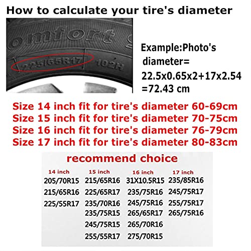【Dimensioni】Ci sono quattro dimensioni (14 15 16 17 pollici), si adattano a tutti i diametri dei pneumatici da 23,6 pollici a 32,7 pollici, puoi fare riferimento alle immagini che forniamo per scegliere la dimensione appropriata.