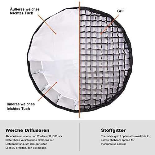 Panno riflettente professionale: perfetto effetto luce morbida: la Softbox GODOX QR serie ha un interno argentato riflettente per creare un contrasto elevato e una luce croccante. Ensure che la luce è riflessa all'interno per ottenere anche un effetto di luce. La griglia a nido d'ape ripristina efficacemente la gamma di luce e garantisce un controllo della luce più preciso