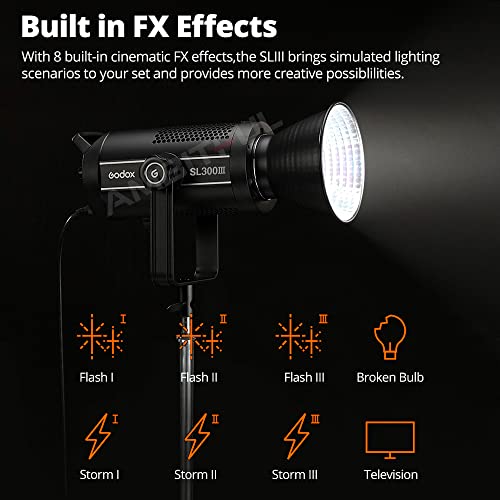 【Built-in 8 FX light effects】 The Godox SLIII built-in 8 FX Effects for a variety of lighting scenes, including Flash1, Flash2, Flash3, Storm1, Storm2, Storm3, TV and Broken bulb, easily meet the needs of creative shooting.