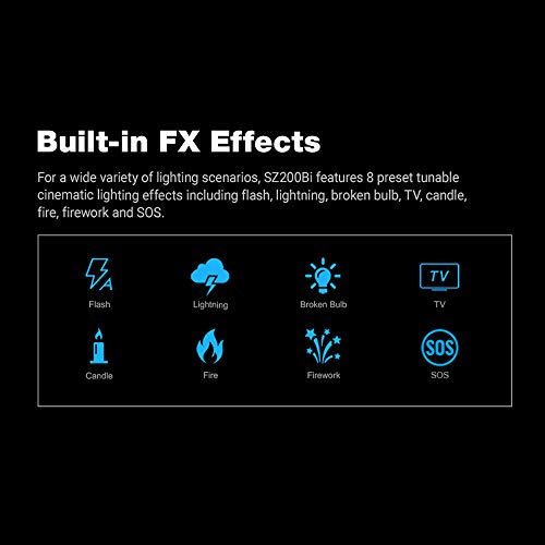 【Special Effects】Built-in 8 categories, 22 kinds of light effects for a wide variety of lighting scenarios,SZ200Bi features 8 preset tunablecinematic lighting effects including flash, lightning, broken bulb, TV,candle,fire, firework and sos.