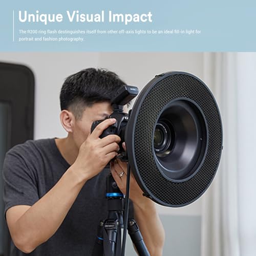 Design ad anello R200: diametro 18,8 cm, il design ad anello consente di scattare dall'asse centrale della luce. R200 rende un'incredibile illuminazione uniforme eliminando spiacevoli punti di luce. R200 è una luce di riempimento ideale per ritratti e fotografie di moda.