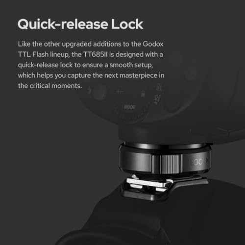 TT685II ha aggiornato il blocco a sgancio rapido, questo design può garantire che il flash sia bloccato in modo sicuro quando viene utilizzato sulla fotocamera e il flash può essere sbloccato facilmente e rapidamente quando lascia la fotocamera, L'installazione e lo smontaggio sono più veloci, quindi hai più tranquillità.