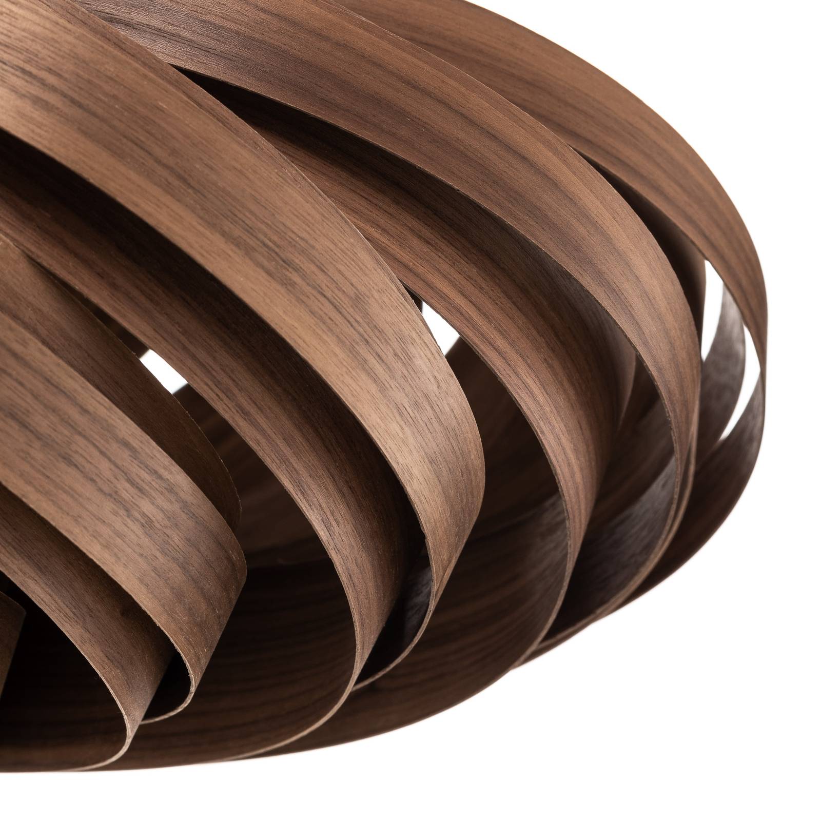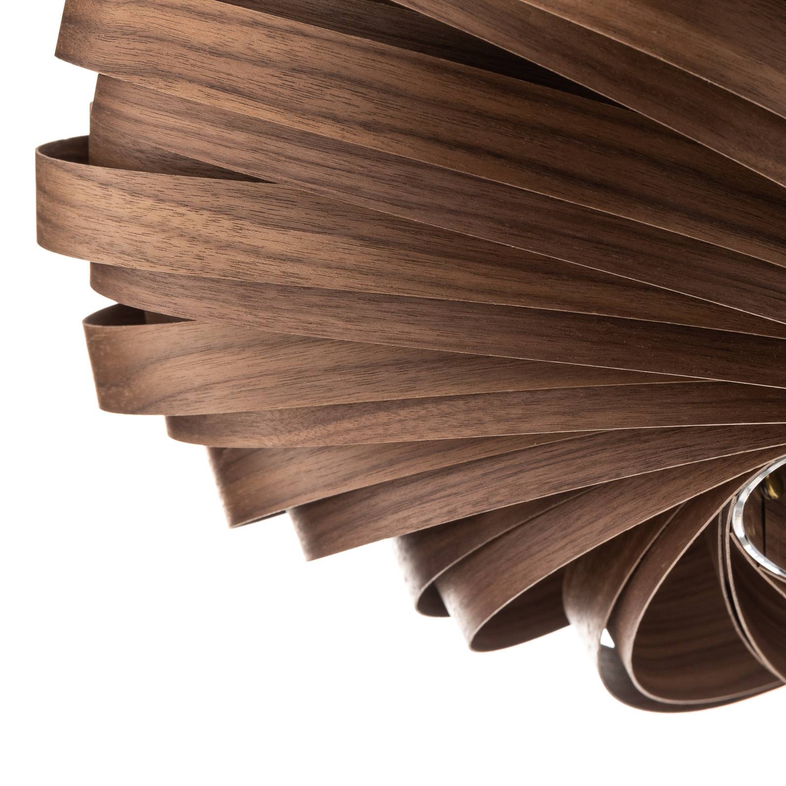 Fatto a mano con impiallacciatura di noce: Plafoniera Veneria Veneria è una lampada da soffitto che può anche essere montata a parete come fonte di luce. Questo apre innumerevoli possibilità di utilizzo come fonte di luce principale o come fonte di luce aggiuntiva. La forma a spirale si ispira alla natura, dove le disposizioni a spirale della sequenza di Fibonacci possono essere viste ovunque. L'impiallacciatura di legno mostra una struttura di base discreta, è simile al legno dell'albero di noce e ha un aspetto estremamente elegante. Le doghe di legno larghe si alternano qui con doghe più strette, creando un effetto decorativo di luce e ombra. La presa per la fonte di luce è posta all'interno e circondata da un corpo di plexiglass trasparente. La luce emessa dalla lampada utilizzata illumina l'impiallacciatura di legno dall'interno ed è diretta verso l'esterno lungo le lamelle. Questo mette anche abilmente in evidenza la grana. - Protetto contro lo sbiadimento dalla luce del sole con vernice UV La nobile Veneria proviene da una piccola manifattura di Colonia, fondata da Manuel Döpper nel 2019. Le lampade di Gofurnit sono fatte di legno cresciuto naturalmente e hanno le loro venature molto vivaci, rendendo ogni pezzo unico. Solo i pezzi migliori sono usati nella selezione dell'impiallacciatura. Le lampade sono spedite in un imballaggio sostenibile per conservare le risorse.