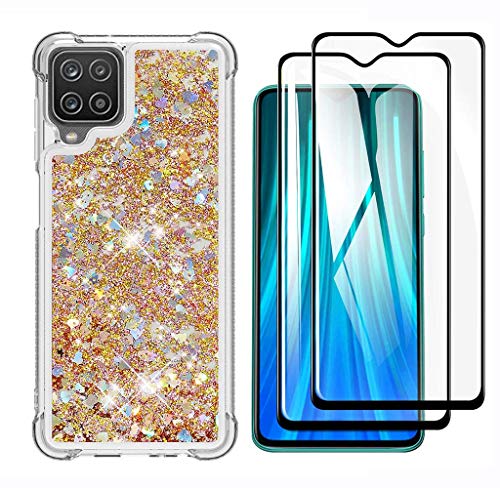 GOGME Cover per Samsung Galaxy A12/M12 Cover + 2 Vetro Temperato, Custodia in Liquido Quicksand con Brillantini, Samsung Galaxy A12 Case in TPU Antiurto Ultra Sottile in Silicone Morbido, d'oro