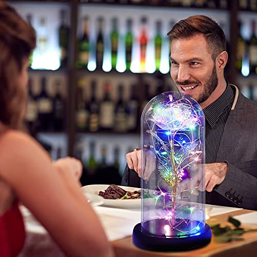 Gohytal Rosa Bella e la Bestia, Rosa Eterna, Elegante Cupola di Vetro con Base Pino Luci LED, Regali di Compleanno, Regali di Valentino, Matrimonio Decorazioni, Regalo Festa Della Mamma