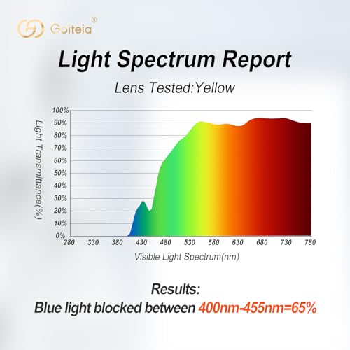 Occhiali con blocco della luce blu al 65%: test professionali mostrano che le lenti gialle Goiteia possono filtrare il 65% della luce blu nella "zona di soppressione della melatonina" (380-500 nm). Sono altamente efficienti nel ridurre l'affaticamento degli occhi e il disagio causati da un'esposizione prolungata dello schermo.