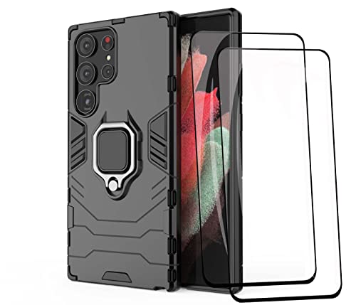 GOKEN Cover per Samsung Galaxy S23 Ultra 5G + 2 Vetro Temperato, TPU/PC Dual Layer Hybrid Armor Custodia con Supporto Magnetico Auto, Silicone Case con 360° Girevole Anello, Nero