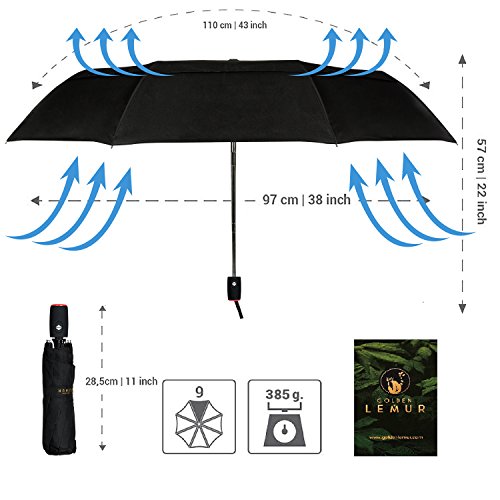 " DESIGN E LUNGA VITA. GOLDEN LEMUR offre ombrelli di design resistenti, compatti e accattivanti con manici e tessuti di diversi colori. Si tratta di un grande ombrello, arco 110 centimetri 97 di diametro e 57 centimetri alto, perfettamente copre una persona. Le dimensioni chiuse sono 28,5 cm e hanno un peso di 385 gr, che lo rende un perfetto ombrello da viaggio. Questo nero, blu, rosso, giallo, rosa ombrello è un regalo ideale per gli uomini e le donne, che unisce l'eleganza e la qualità. "