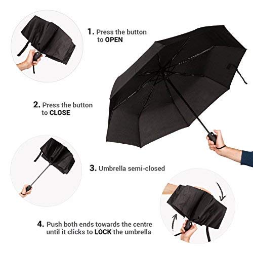 DIMENSIONI COMPATTE. Ombrello da borsa comodo da trasportare anche nello zaino o nella valigetta. È un ombrello grande, 110 centimetri di arco, 97 cm di diametro e 57 centimetri di altezza, che può coprire perfettamente due persone. Le dimensioni quando è chiuso sono di 29 centimetri e il peso è di 385 grammi, questo lo rende un perfetto ombrello da viaggio.