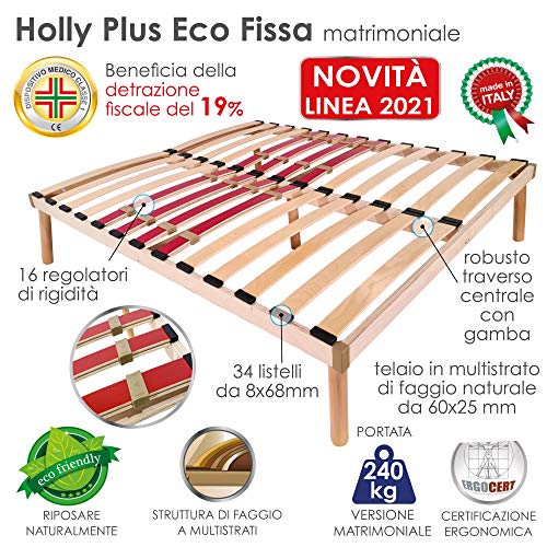 Goldflex Rete Holly Plus Eco Matrimoniale 160x190 a Doghe in Legno Multistrato di faggio Struttura Rinforzata Regolazione Rigidità Lombare Gambe avvitabili h. 35 cm Dispositivo Medico Detraibile