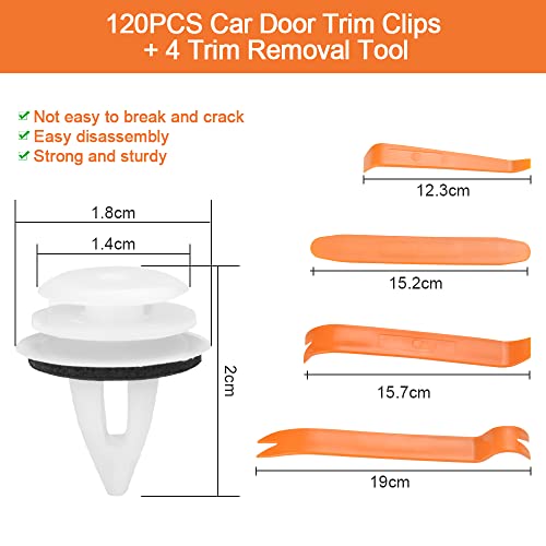 【120 Rivetti in plastica per auto】Il set di clip decorative fisse per auto contiene 120 clip bianche per portiera dell'auto da 1,8 x 2 cm e 4 diverse forme e dimensioni di strumenti per la rimozione della decorazione (19 cm, 15,7 cm, 15,2 cm, 12,3 cm), che possono soddisfare le tue esigenze di utilizzo e sostituzione, consentendoti di rimuovere le modanature dei pannelli porta senza danneggiare l'interno dell'auto.