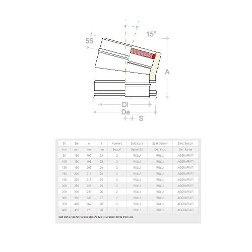 Gomito curva acciaio inox doppia parete Di 80 - De 130mm (15 gradi)