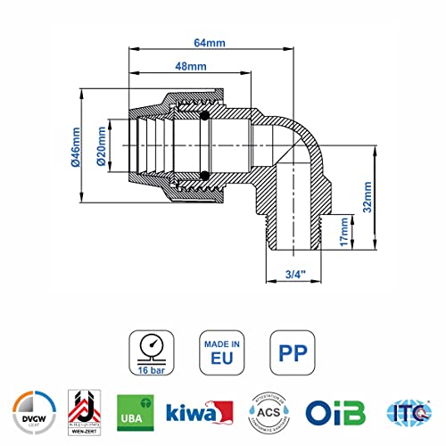 Indistruttibili fino a 16 bar: I nostri raccordi a Gomito a 90 gradi 20mm con filetto esterno da 3/4" sono resistenti agli agenti atmosferici, ai raggi UV, alle temperature anomale e dureranno a lungo. Resistono a una pressione fino a 16 bar e sono sicuri e certificati per acqua potabile.
