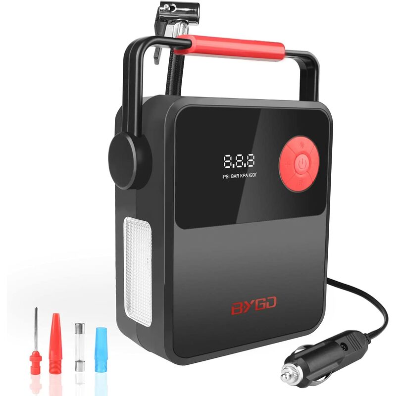 Facile da usare, si ferma quando è pieno - Collega il cavo di alimentazione del compressore d'aria portatile alla presa accendisigari da 12V dell'auto, collega l'ugello di gonfiaggio alla valvola del pneumatico, quindi imposta il valore di pressione desiderato sul pneumatico e premi l'interruttore su iniziare l'inflazione. Quando viene raggiunta la pressione dei pneumatici desiderata, la pompa del compressore d'aria si spegne automaticamente. 【Display digitale intelligente】 La pompa dell'aria elettrica è dotata di un display digitale accurato e luci a LED luminose e resistenti per soddisfare il tuo gonfiaggio esigenze in ambienti con scarsa illuminazione. Il display digitale mostra la pressione dei pneumatici in tempo reale, aiutandoti a visualizzare la pressione dei pneumatici e i valori di pressione dei pneumatici preimpostati. 【Materiale】 Il gonfiatore per pneumatici del compressore d'aria ha un blocco cilindri completamente in metallo aggiornato, bobine interamente in rame, e un