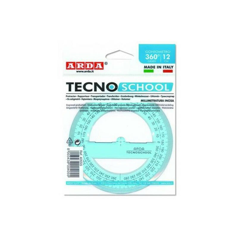 Goniometro Linea Tecnoschool in polistirolo termoresistente colore azzurro trasparente. Graduazione incisa, bordo tirachina, busta in materiale ecologico riciclabile. Uso scolastico.