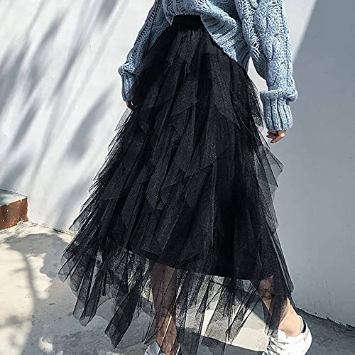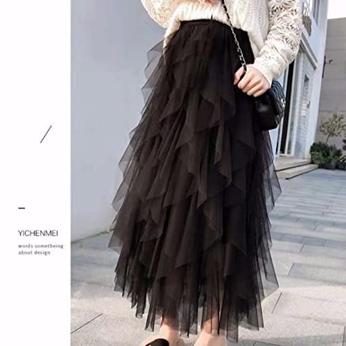Gonna Lunga in Tulle da Donna Tinta Unita a Vita Alta Elastica Orlo Irregorabile con Strato di Fodera Gonne Casual Elegante Vintage a Pieghe Linea A alla Moda per Adulta (Nero, Taglia Unica)