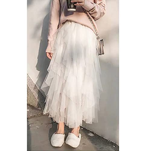 Gonna Lunga in Tulle da Donna Tinta Unita a Vita Alta Elastica Orlo Irregorabile con Strato di Fodera Gonne Casual Elegante Vintage a Pieghe Linea A alla Moda per Adulta (Bianco, Taglia Unica)
