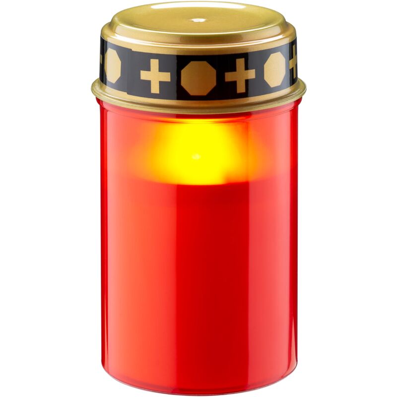 Lampada a LED per tombe, rossa con effetto tremolante realistico, bianco caldo (3000 K), a batteria (2x AA), per uso interno ed esterno (IP44). L'illuminazione tremolante della luce funebre a LED offre un effetto candela realistico, soprattutto al crepuscolo e di notte. Elegante lumino a batteria che, a differenza delle candele vere, non richiede il rinnovo quotidiano della luce. La copertura resistente alle intemperie protegge la candela elettrica dall'umidità, per cui la luce tombale può essere collocata direttamente sulla tomba o in una lanterna. Grazie al grado di protezione IP44, il lume funebre è adatto all'uso in interni e in esterni. Discreto interruttore di accensione/spegnimento accanto al LED all'interno della lampada funebre, da azionare tramite il coperchio rimovibile. Funziona a batterie (2x AA, non incluse). Dimensioni: 12,3 x 7,3 cm Dati tecnici Batteria Numero di celle 2 pezzi Tecnologia Batteria alcalino-manganese (alcalina) Tensione 1.5 V Potenza Fonte di luce Diodo