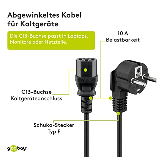 Goobay 68604 Cavo di alimentazione per apparecchi freddi, alimentazione angolata su un lato, spina di sicurezza (tipo F, CEE 7/7) fino alla presa C13 (collegamento apparecchio freddo), nero, 1,5 metri