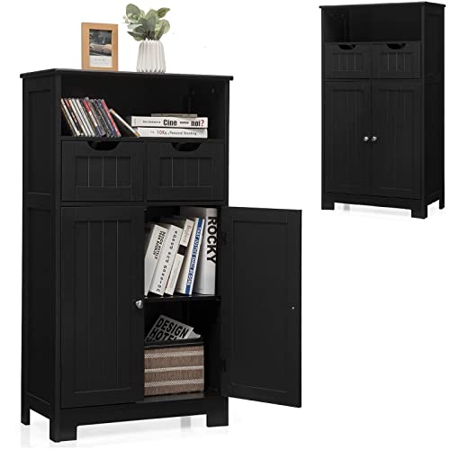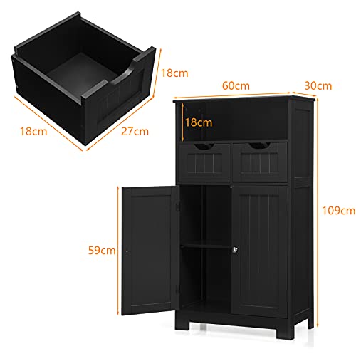 GOPLUS Armadio Bagno da Terra, a Ripiani Regolabili, 2 Ante con Maniglie, 2 Cassetti Rimovibili, Superficie con Vernice, in Legno, 60x30x109cm (Nero)