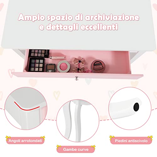 Design attrattivo: La nostra specchiera per bambina ha un design giocoso e vivace. Lo specchio semplice dalla cornice bianca ricorda la forma di un castello, il tavolo misura 69,9 cm x 34 cm x 95,4 cm ed è dotato di un cassetto rosa. Lo sgabello bianco misura 29,7 cm x 29,7 cm x 31,4 cm