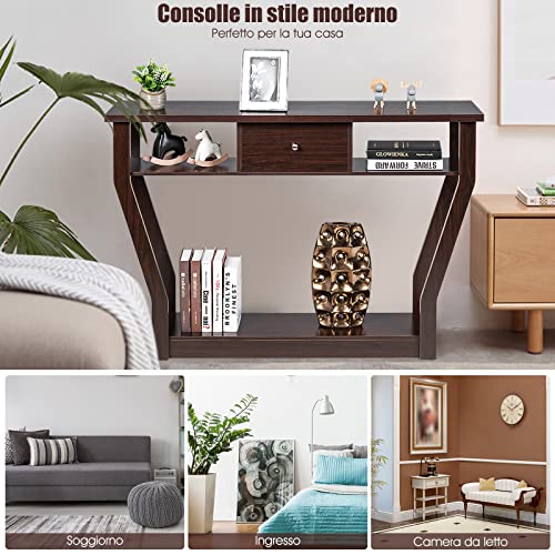 GOPLUS Tavolo Consolle da Ingresso, con 1 cassetto e 2 Scomparti Aperti, in Stile Moderno, per Ingresso/Salotto/Soggiorno, 120 x 30 x 81 cm (Marrone)