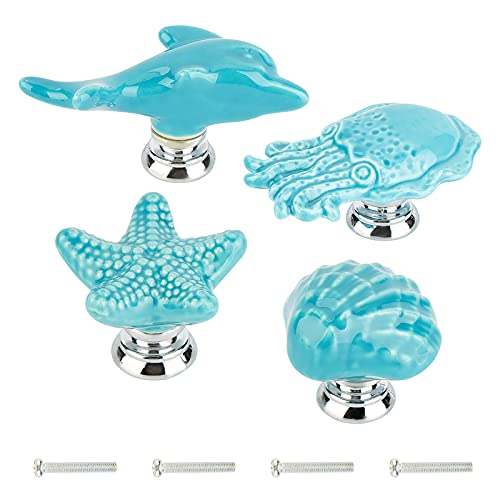 GORGECRAFT 4 Sets Starfish Octopus Shell Dolphin Pomelli per Armadietto In Ceramica Animali Marini Tema Oceano Stile Cartone Animato Manopola per Comò Fatta A Mano Maniglie (Blu)