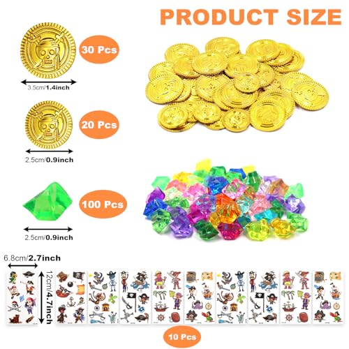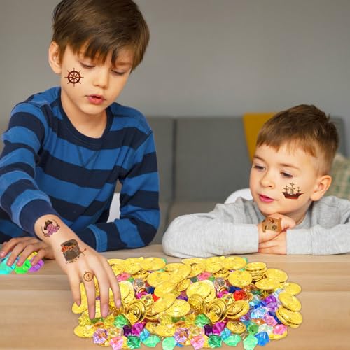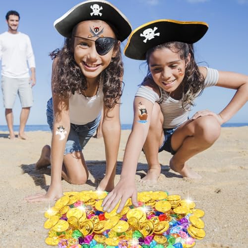 GOTFUN Set di 100 pietre da pirata, 50 monete da pirata, con 10 adesivi per tatuaggi, gemme per il compleanno dei bambini, decorazione di compleanno per feste di compleanno