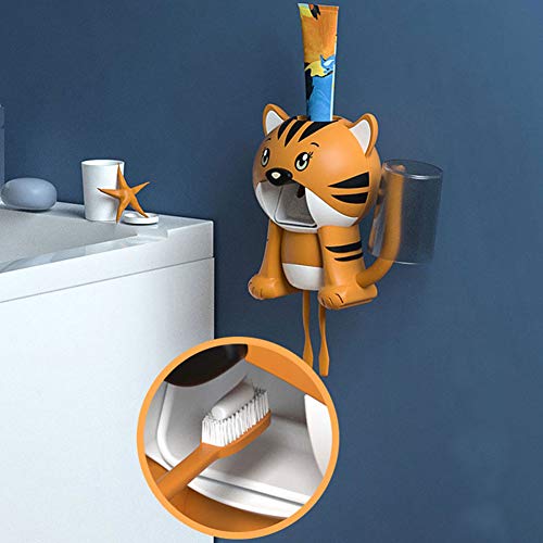 GOTOTOP Portaspazzolini per Bambini con Tazza, Simpatico Cartone Animato Dispenser di dentifricio a Mani libere per Bambini Kit di spremiagrumi Automatico per dentifricio a Parete(Giallo)