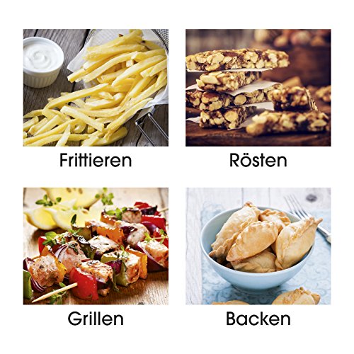 BASSO GRASSO E SALUTE - Con questa friggitrice ad aria calda è possibile friggere, grigliare, cuocere al forno, arrostire, riscaldare e anche scongelare quasi completamente senza olio. L'apparecchio è dotato di un display digitale per la massima facilità d'uso e di un controllo della temperatura da 80-200 °C.