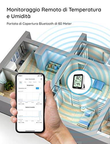 Portata remota fino a 60m: La funzione bluetooth consente monitoraggio remoto di temperatura e umidità sull'App Govee Home. Il può in cameretta, asilo nido, cantina, seminterrato, magazzino e serra.