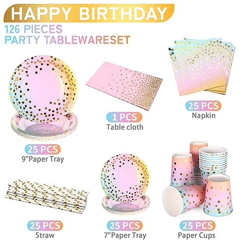 ◊【Misura del Servizio Perfetto】126 pezzi di stoviglie di carta per compleanno, inclusi 25 piatti da 9 pollici, 25 piatti da 7 pollici, 25tovaglioli, 25 da Tazze, 25 da Cannucce e 1 Tovaglia.