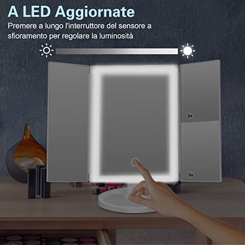 1X/2X/3X MAGNIFICAZIONE: 1X vero specchio al centro e sul lato sinistro, 2X e 3X specchio d'ingrandimento sul lato destro, questo specchio di vanità led fornisce una visione grandangolare e creare una visione ultra chiara della vostra pelle per rendere il vostro vestito più facile e perfetto, grande per l'applicazione di eyeliner, mascara, sopracciglia grooming, e tweezing.