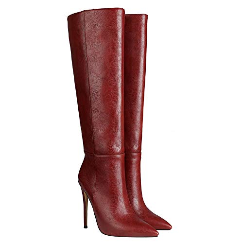 Gracemee Moda Stivali Alti Donne Wide Open Stiletto Tacco Alto Western Boots Pull on Punta Punta Party Boots Animal Print Patterned Claret Size 35