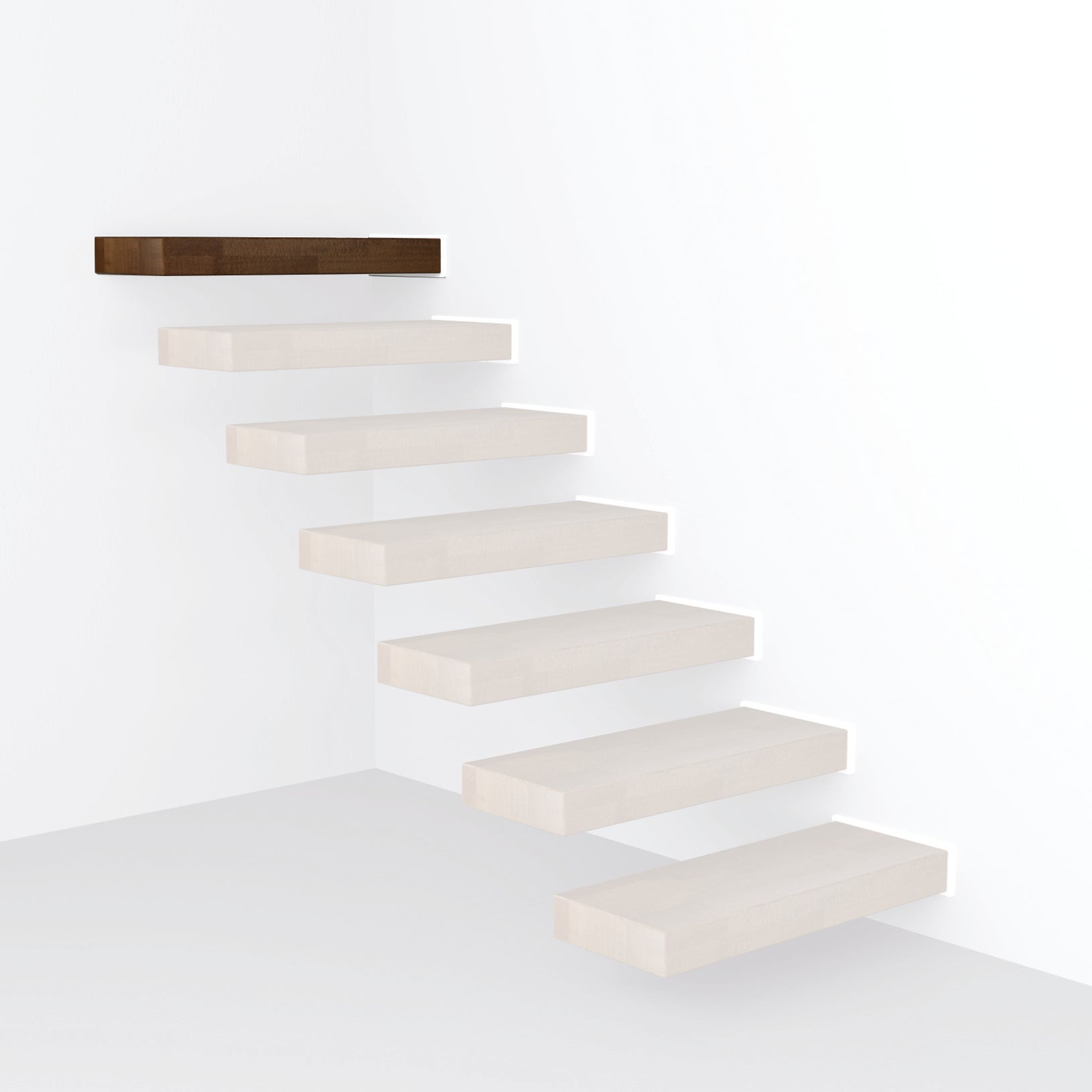 Gradino finale L 80 in legno massello di faggio di colore faggio noce scuro da combinare con gli altri gradini della serie Wall. Gradino con fissaggio al solaio.. Ideale per configurazioni lineari, con o senza foro solaio, ad altezza personalizzabile. Il fissaggio direttamente alla parete crea un effetto sospeso di grande impatto visivo